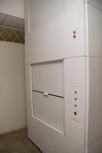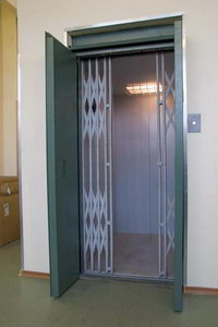 Кабина грузового лифта изготавливается из металлических модулей, окрашенных твердым лакокрасочным покрытием, нанесенным с помощью порошковой технологии, и снабжена дверью типа «Бо-ствиг». Пол кабины выполнен из рифленого стального листа. Исполнение дверей шахты для грузовых лифтов - двустворчатые ручные распашные.